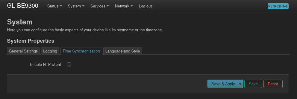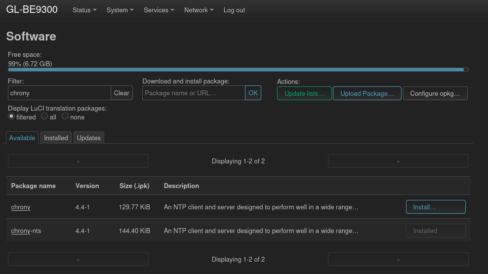 Installing a new package is pretty easy. Both GL admin panel and LuCI allows us to search and install packages. Before installing chrony, I needed to turn disable the default NTP client first.